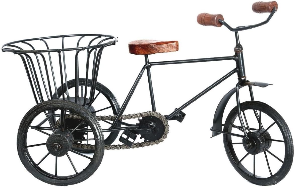 The Hue Cottage Antique Look Model Miniature Three Wheels Bicycle Figurine With Flower Bucket By Wrought Iron And Wood For Home Decoration Showpiece Gifting 36 X 13 X 16 Cms
